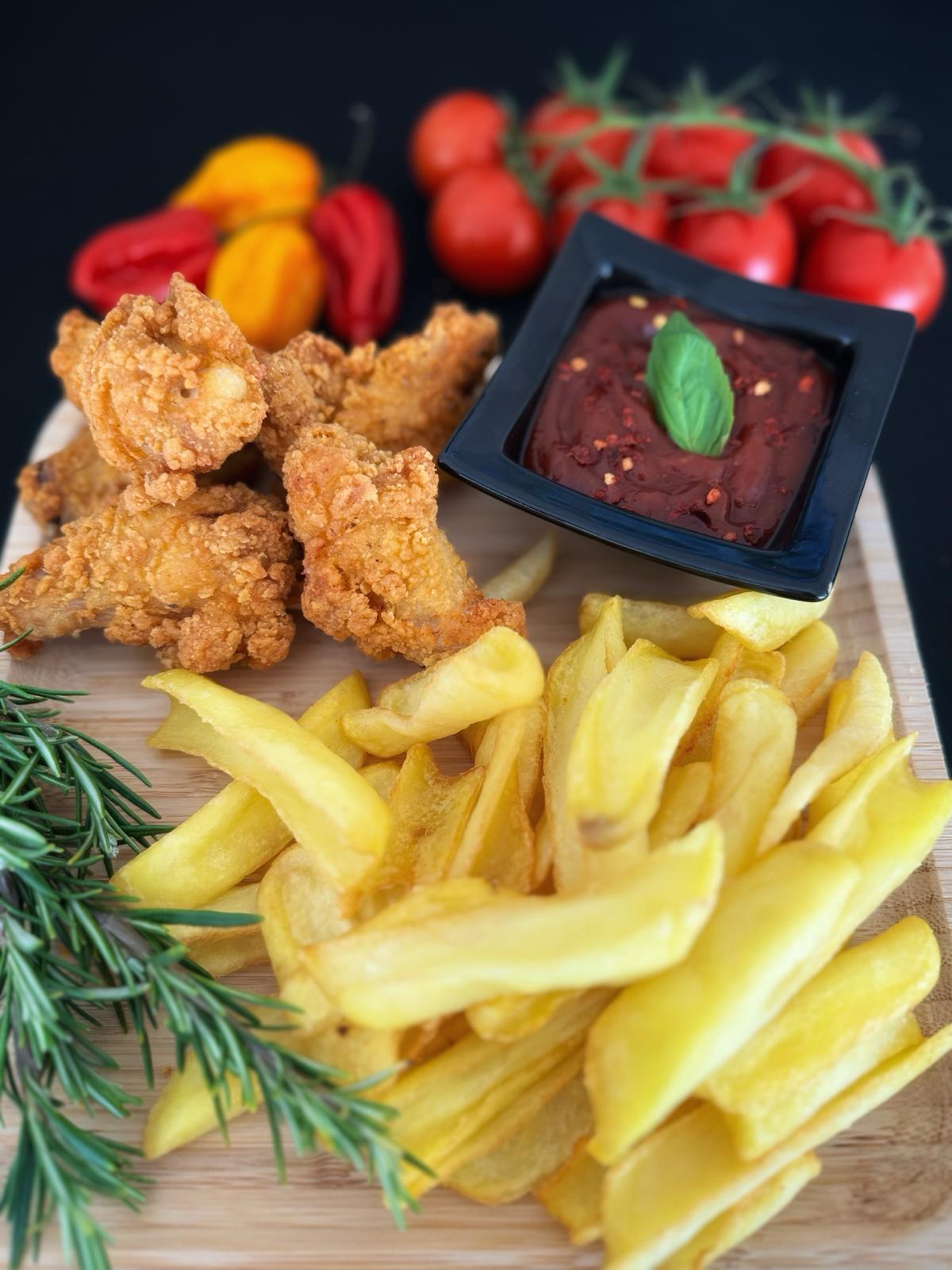 Contine: Aripioare wings 5 buc. 150G, cartofi prajiti 150G, sos ketchup 50G, sos usturoi 50G, lipie 70G;