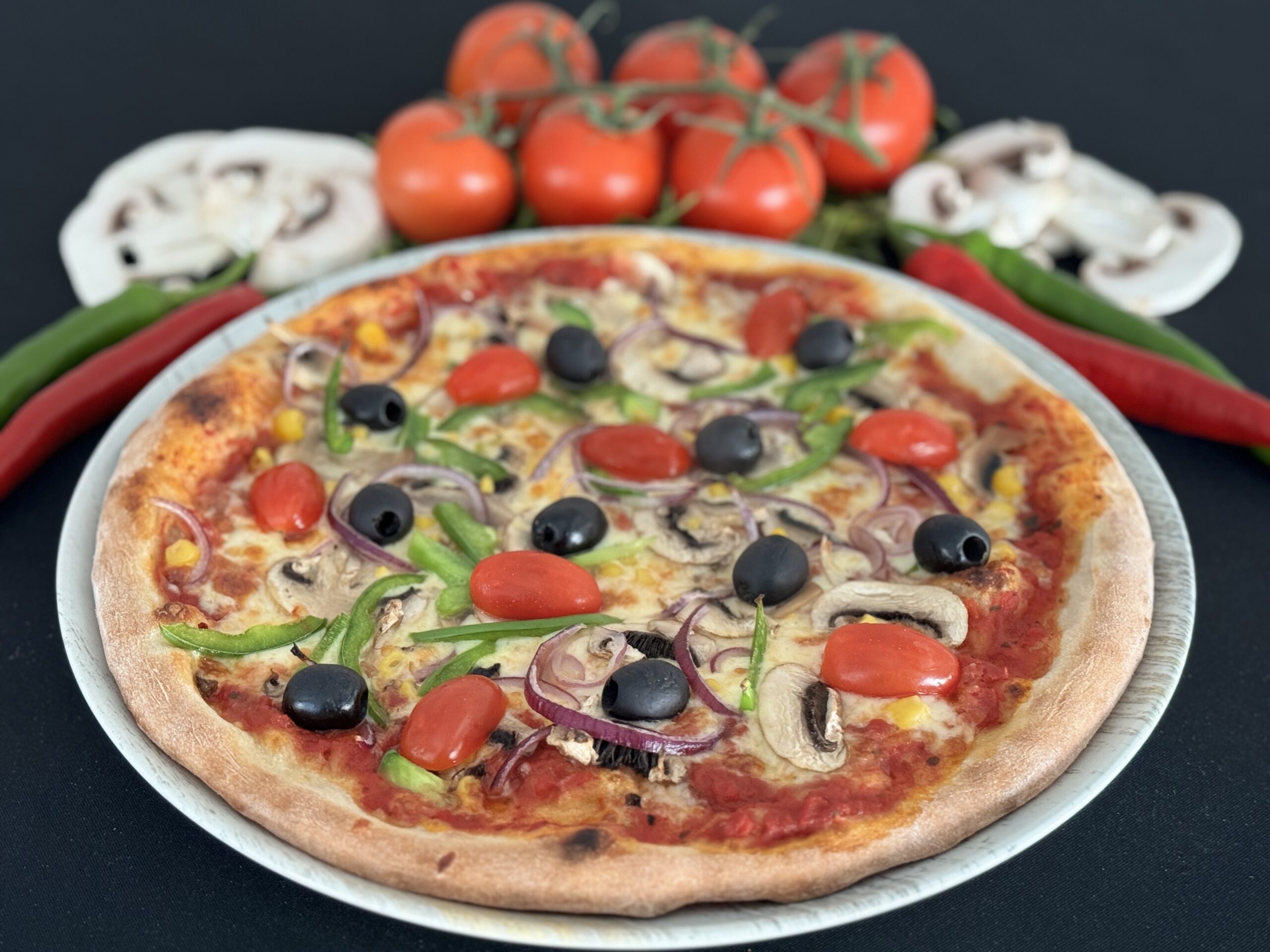 Ingrediente: Blat 270g (Faina de grau alba 550), Sare gema, Iodat de potasiu: min. 42 mg/kg sare, max. 67.2 mg/kg sare. Iod: min. 25 mg/kg sare, max. 40 mg/kg sare, antiaglomerant (E 536), Drojdie pentru panificatie, emulgator alimentar E491, sos pizza 70g (Roșii cuburi 60% (roșii, suc de roșii, regulator de aciditate: acid citric), pastă de roșii 35%, ceapă rehidratată, ulei de rapiță, zahăr, sare, oregano, busuioc, măghiran), mozzarella 120g (Lapte de vaca pasteurizat, sare, culturi lactice, cheag, agent antiaglomerant: amidon din cartofi), rosii 30g, ceapa 10g, masline 20g (Masline fara samburi, innegrite prin oxidare, apa, sare, corector de aciditate: acid lactic, stabilizator: lactat feros.), ciuperci 20g, porumb 10g (Porumb dulce boabe, apa, sare (Sare gema, Iodat de potasiu: min. 42 mg/kg sare, max. 67.2 mg/kg sare. Iod: min. 25 mg/kg sare, max. 40 mg/kg sare, antiaglomerant (E 536));